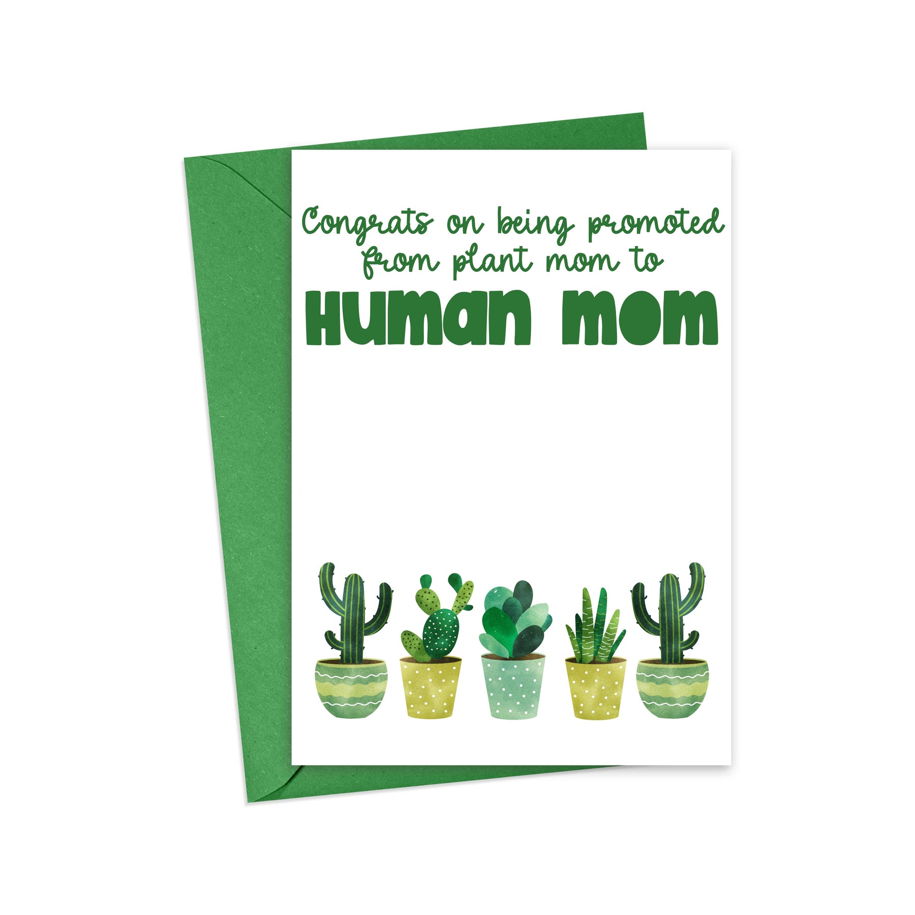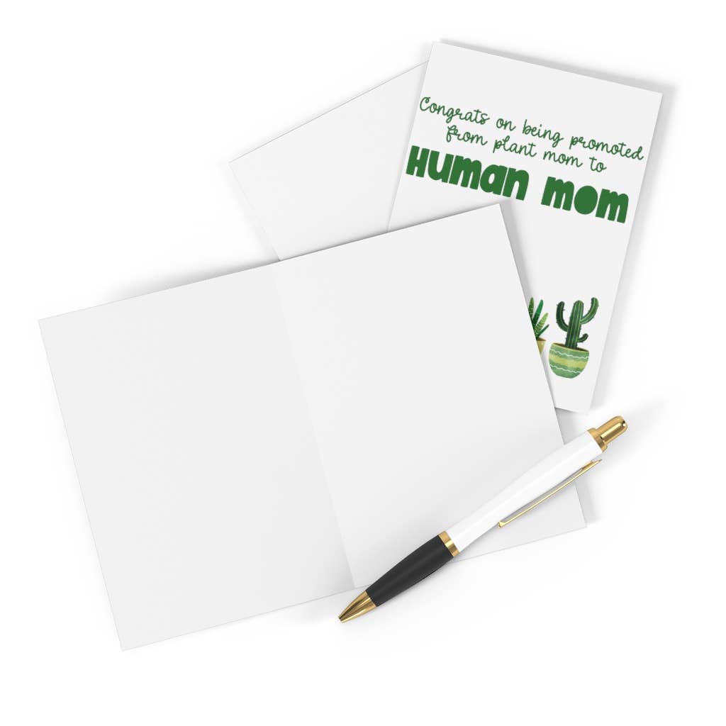 Funny Baby Card for Expectant Mom Phrase: Congrats on being Promoted from Plant Mom to Human Mom - A2 Folded Card [Size: 4 1/4 x 5 1/2"] - A2 Green Envelope [Size: 4 3/8 x 5 3/4 in.] - Interior Card: Blank