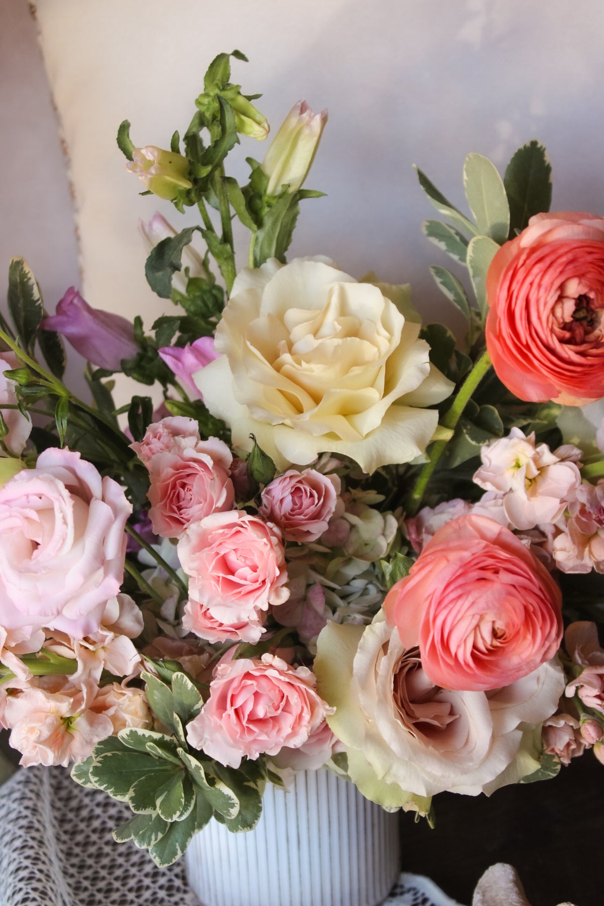 Warm, tender, and effortlessly sweet. The Meg wraps you in blush and creamy neutrals with quicksand roses, butterfly ranunculus, airy lisianthus, and pink campanula. Think cozy cafés, handwritten notes, and quiet moments that make your heart flutter. Classic romance that feels like a rom-com.