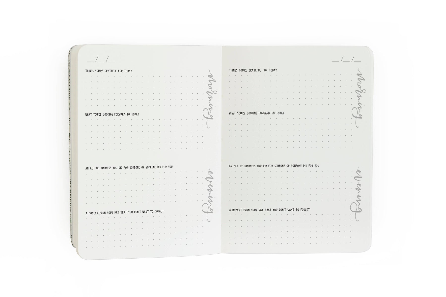 With gratitude comes joy. This journal helps you record your favorite moments and practice daily gratitude with simple writing prompts for the morning and evening. Features | Linen paper back cover with white gold foil title, undated daily entries. Interior | 136 dot grid pages, 115 gsm cream cardstock Size | 5.25" x 7.25"